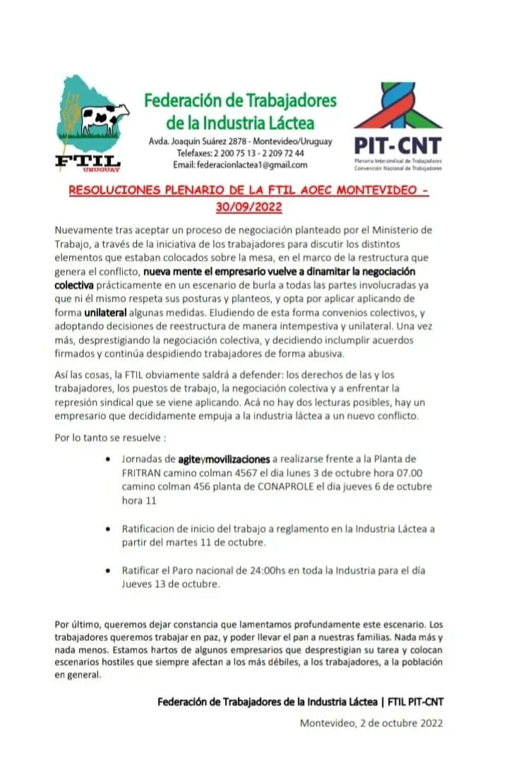 Este domingo la Federación de Trabajadores de la Industria Láctea (FTIL) divulgó un comunicado en el que expone las resoluciones adoptadas en el plenario de trabajadores realizado el viernes 30 de setiembre: