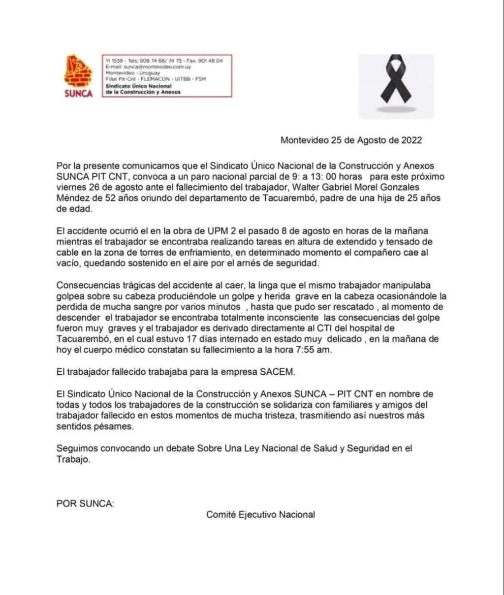 El sindicato de la construcción (Sunca) convocó este jueves 25 a un paro nacional parcial, de 09:00 a 13:00, para este viernes 26, tras la muerte de un trabajador de la obra de la segunda planta de UPM.
