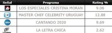 Los números indican que MasterChef Celebrity fue, una vez más, el programa más visto del día con 12,88 puntos (unos 62 mil hogares en Montevideo).