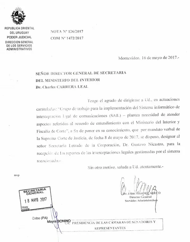 "Por nota Nº 126/2017 de fecha 16 de mayo de 2017, le fue comunicada dicha decisión al Ministerio del Interior, con copia a la Presidencia de las Cámaras de Senadores y Representantes. Esta nota fue recibida por la Secretaría General del Ministerio del Interior con fecha 18 de mayo de 2017, según consta", señaló la SCJ.
