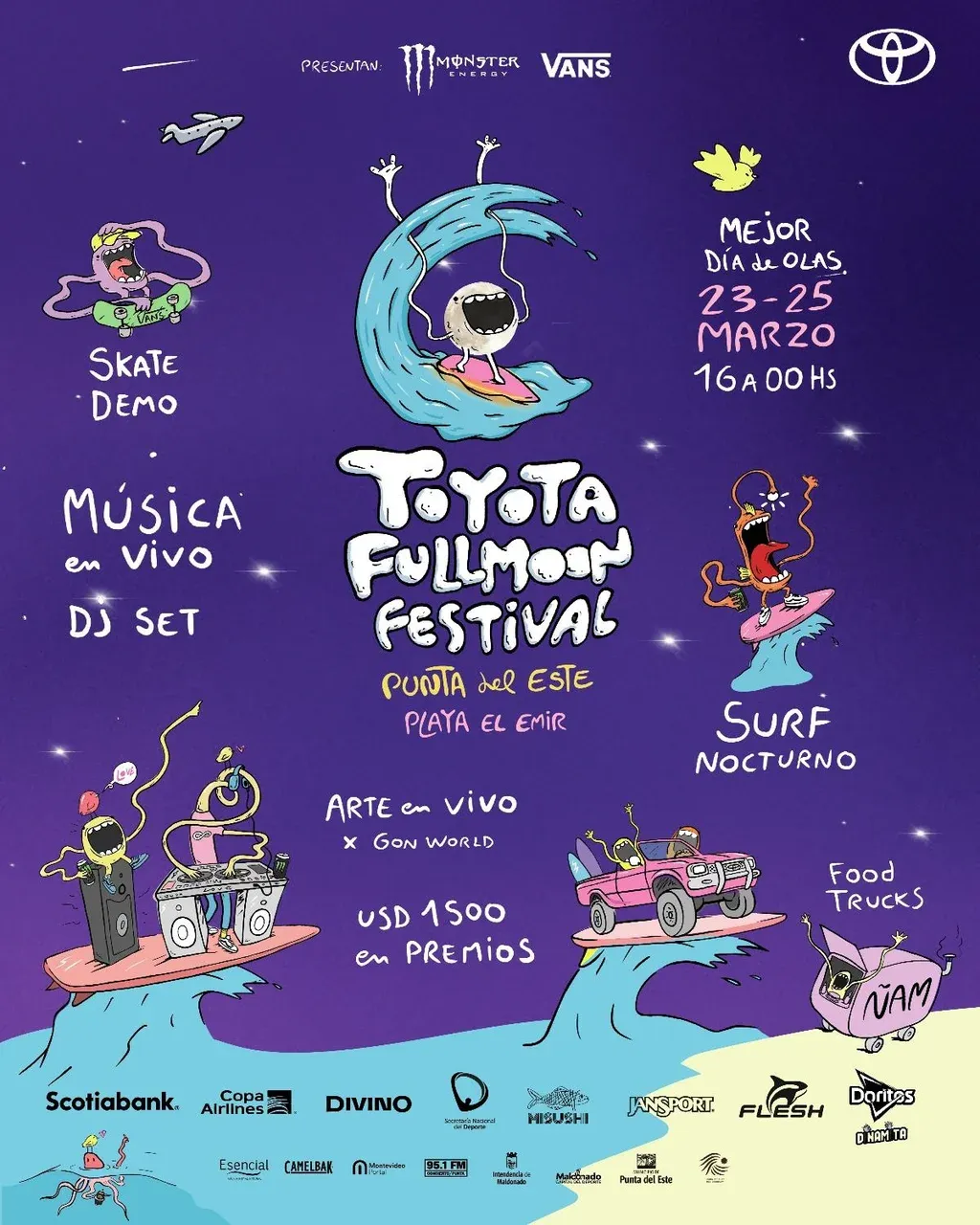Uruguay tendrá por primera vez un torneo de surf nocturno con el Full Moon Festival, evento que se realizará este sábado 23 de marzo por primera edición en la playa El Emir de Punta del Este y que incluirá música, arte, skate y gastronomía.