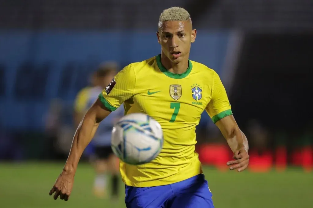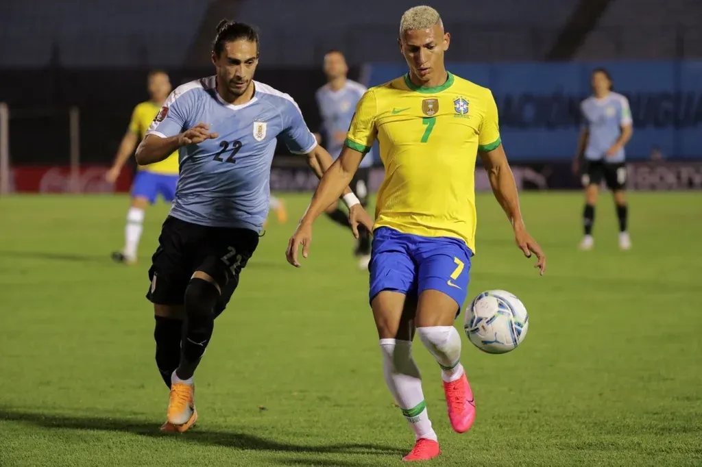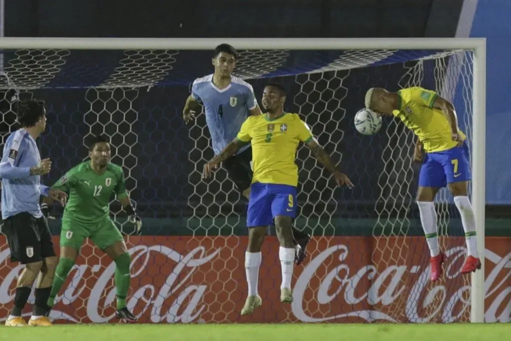 afp efe pool Richarlison jugó un gran primer tiempo en Brasil En la última de la primera parte, llegó un tiro libre de Nicolás De la Cruz y Diego Godín metió un gran cabezazo -en offside- y la pelota volvió a pegar en el travesaño.