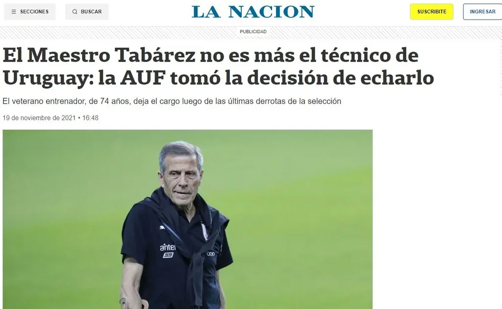En Argentina, el diario La Nación se refirió a la decisión de la Asociación Uruguaya de Fútbol de "echar" a Tabárez.