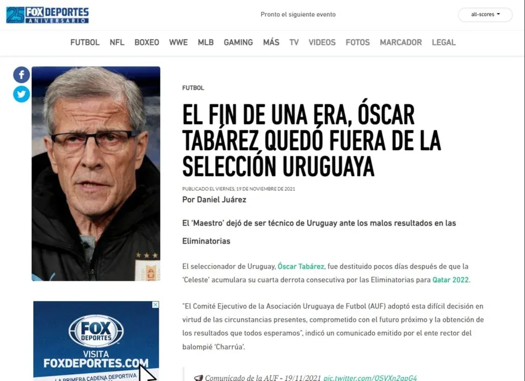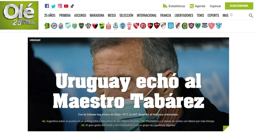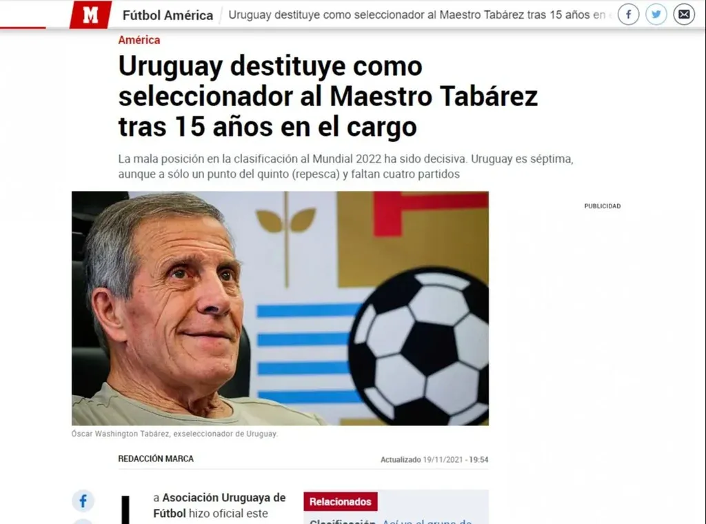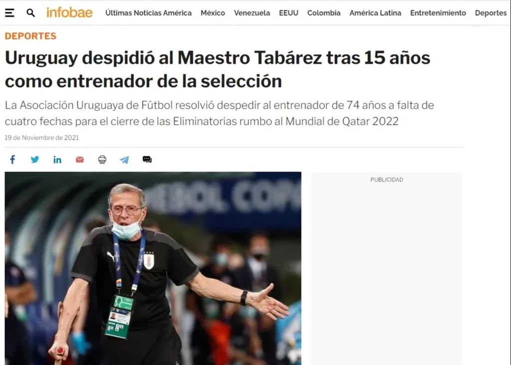 Infobae informa en su página web que Uruguay despidió a Tabárez tras 15 años.