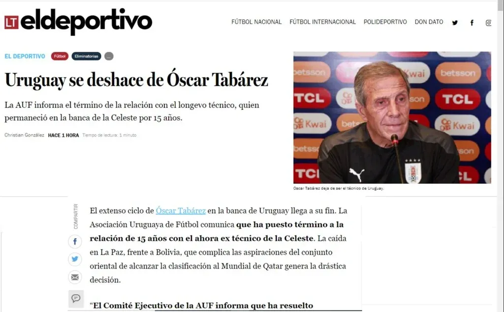 El Deportivo, suplemento del diario chileno La Tercera, titula: "Uruguay se deshace de Óscar Tabárez".