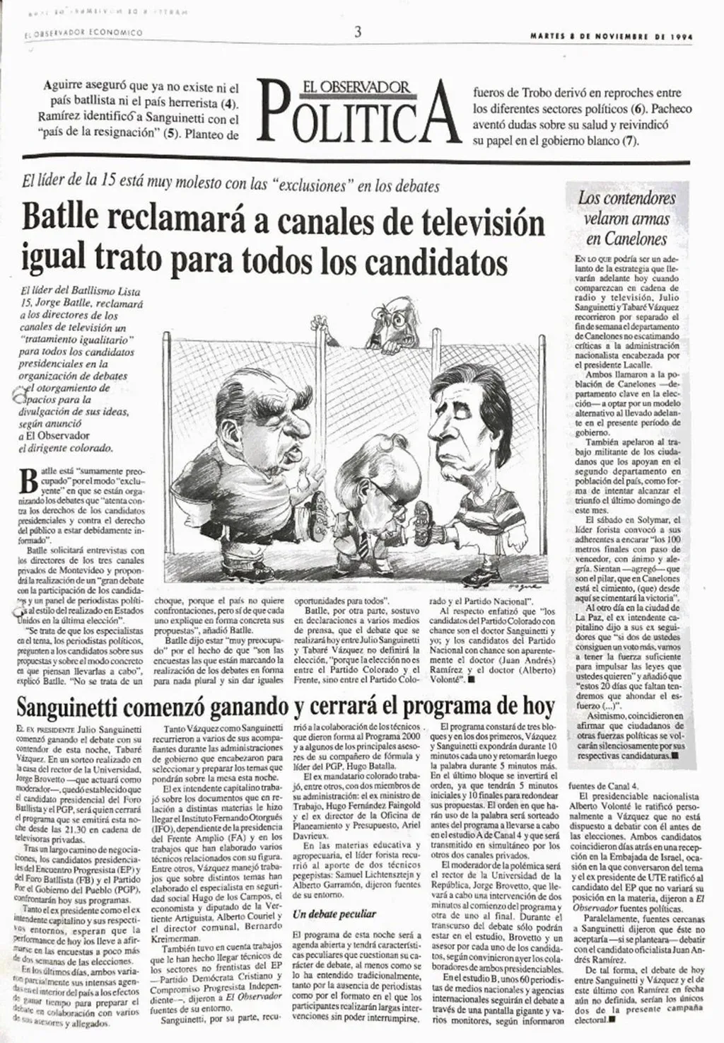 El martes 8 de noviembre de 1994, El Observador publicó una nota titulada Batlle reclamará a canales de televisión igual trato para todos los candidatos, en la que se señalaba que el líder de la lista 15 estaba "sumamente preocupado" por el modo "excluyente" en que se estaban organizando los debates que "atenta contra los derechos de los candidatos presidenciales y contra el derecho del público a estar debidamente informado".