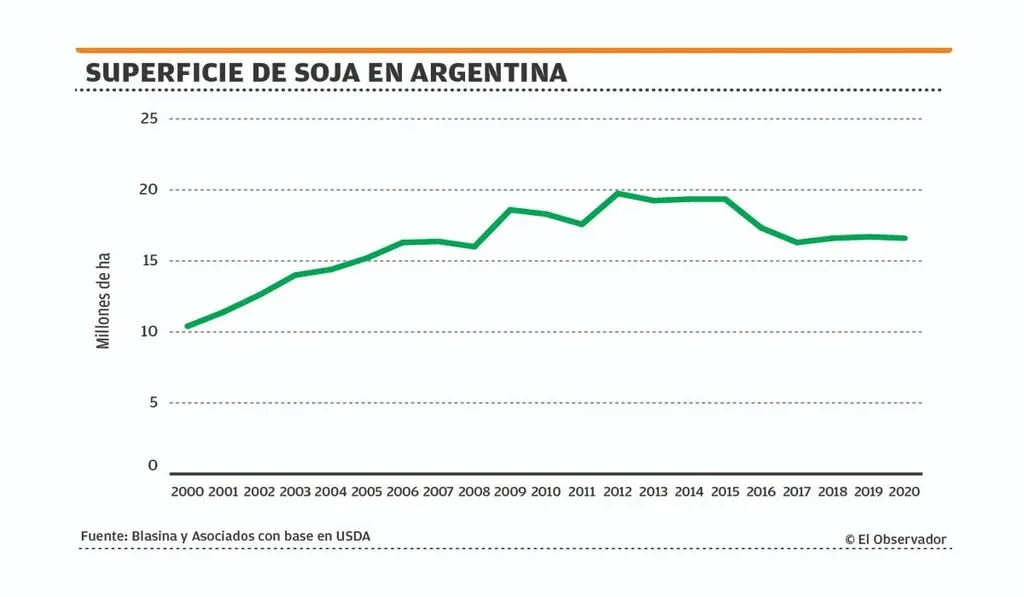 El Departamento de Agricultura de Estados Unidos (USDA) redujo el 6 de julio su estimación de producción de soja argentina en 500.000 toneladas para la actual cosecha pasada, que terminó siendo muy floja, en 44,5 millones de toneladas. La estimación de USDA era de 47 millones. Además, rebajó en 100.000 hectáreas la proyección de área sembrada, estableciéndola en 17,5 millones de hectáreas. Esto reduce la producción total esperada en 800.000 toneladas, de 52 millones hasta 51,2 millones, partiendo de que el cultivo tuviera un rinde normal, algo dudoso dadas las previsiones de Niña.