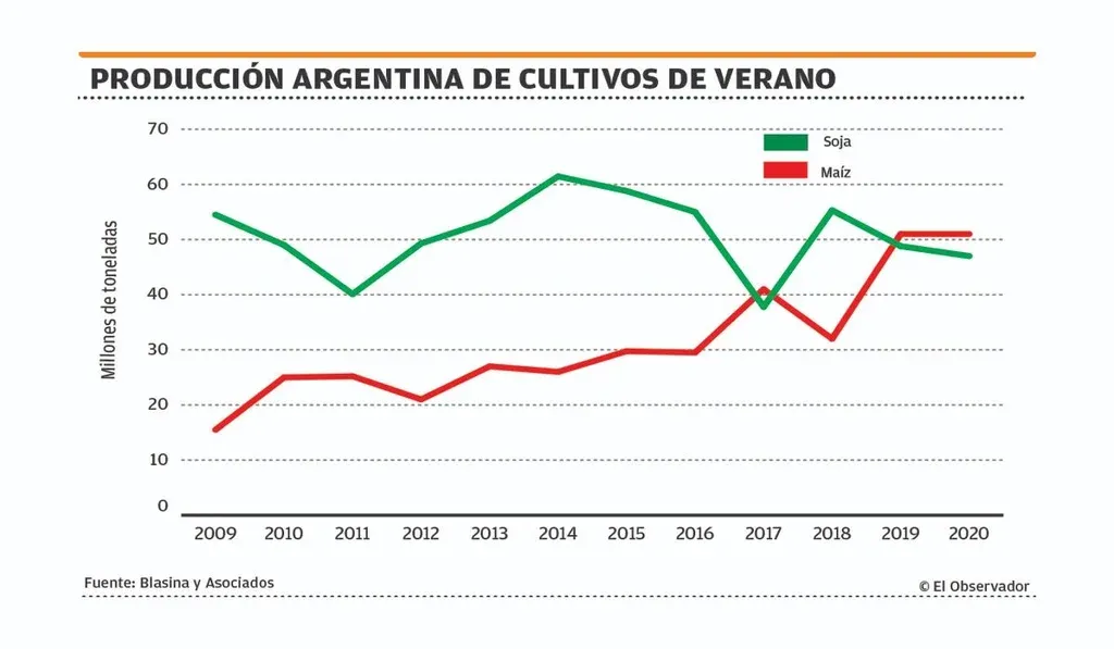 La producción de maíz proyectada en la zafra 2021/22 fue incrementada en el informe del USDA del 20 de julio y superaría a la de la soja: “Se pronostica un récord de 51,5 millones de toneladas, un poco más alto de lo proyectado debido a la superficie ligeramente mayor”. Una nueva realidad que se consolida en los últimos años, tanto por el crecimiento del cereal como por los flojos resultados de la oleaginosa.