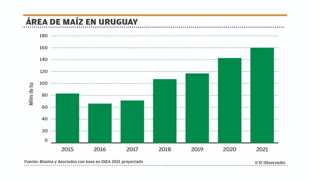 En Uruguay el área de maíz llegó en 2021 a 142.624 hectáreas, un crecimiento sostenido, más de 50% desde 2017/18, con 5.396 kilos de rinde promedio por hectárea en la última zafra, unos 1.140 kilos menos que en la zafra 2019/20.