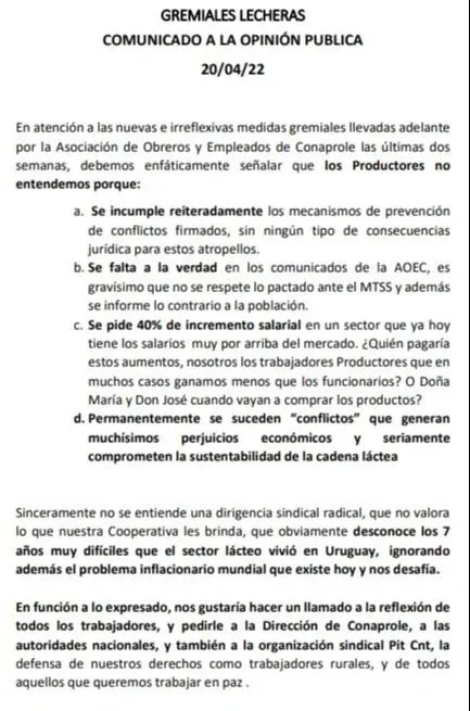 Este comunicado se conoció poco después que la Federación de Trabajadores de la Industria Láctea (FTIL), tras una asamblea general desarrollada en la mañana de este mismo jueves, advirtiera sobre posibles paros, uno de 24 horas incluso, movilizaciones e incluso sobre un "trancazo a las exportaciones".