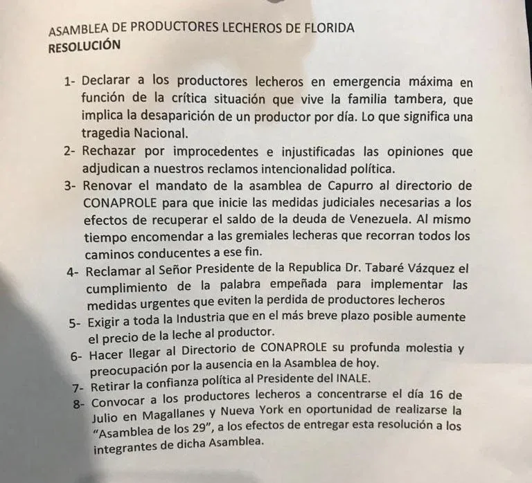 En el mismo, se consideró como “improcedentes e injustificadas” las opiniones de integrantes del gobierno que le atribuyeron “intencionalidad política” a los reclamos del sector primario, y se reiteró el mandato de la asamblea de Capurro en diciembre de 2018 para que Conaprole inicie las medidas legales correspondientes para cobrar la deuda de US$ 30 millones que tiene Venezuela con esa industria.