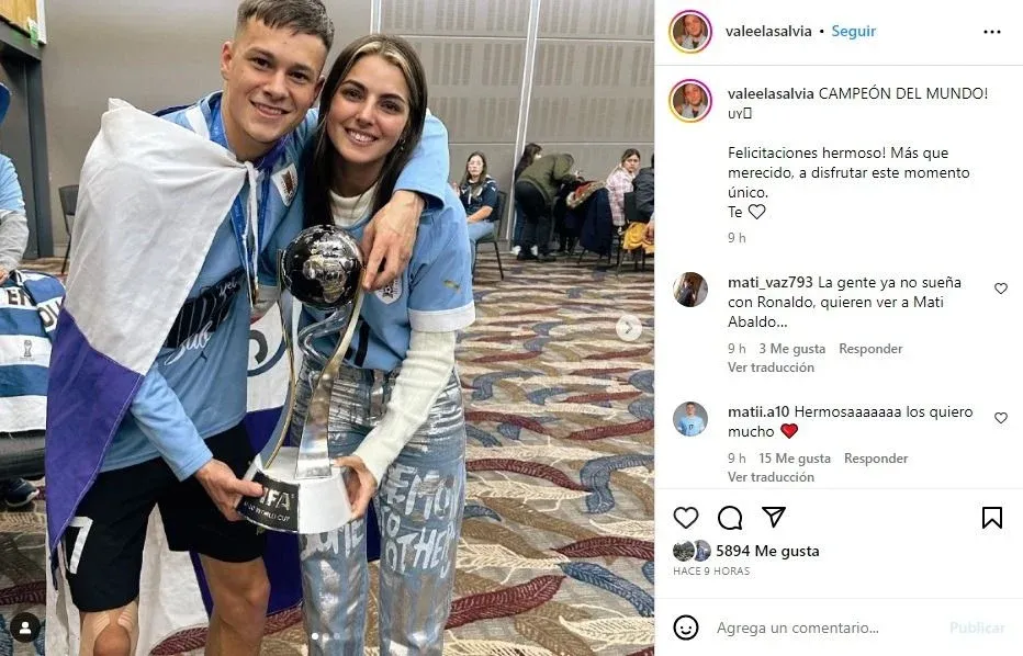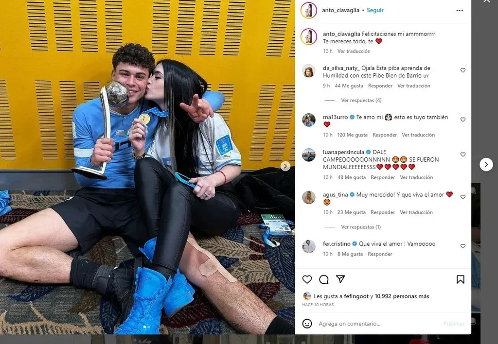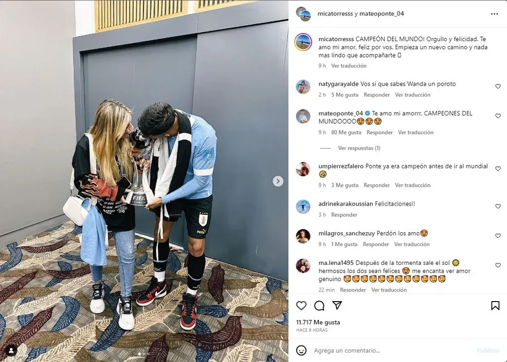"CAMPEÓN DEL MUNDO! Orgullo y felicidad. Te amo mi amor, feliz por vos. Empieza un nuevo camino y nada mas lindo que acompañarte", escribió Mica Torres, novia de Mateo Ponte, quienes suelen mostrarse mucho en las redes.