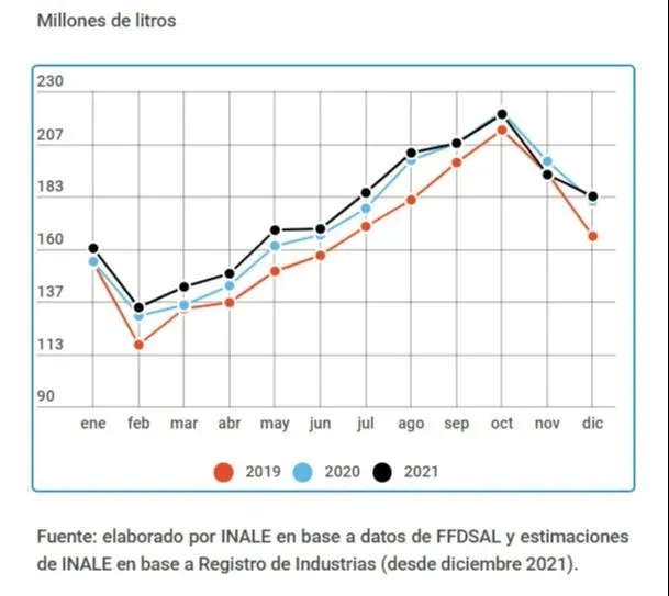 La remisión que hubo en diciembre de 2021 (183,2 millones de litros) fue 1,2% superior a remitido en el mismo mes del año anterior y fue la mejor marca en la historia para el último mes del año, superando levemente lo que se había dado en diciembre de 2013 (183 millones).