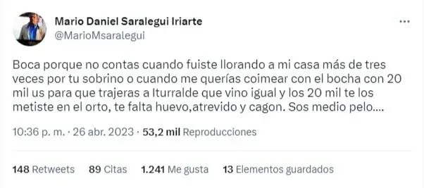 Saralegui le respondió a través de Twitter y escribió: "Boca porque no contas (sic) cuando fuiste llorando a mi casa más de tres veces por tu sobrino o cuando me querías coimear con el Bocha con US$ 20 mil para que trajeras a Iturralde que vino igual y los 20 mil te los metiste en el orto, te falta huevo, atrevido y cagon. Sos medio pelo….".