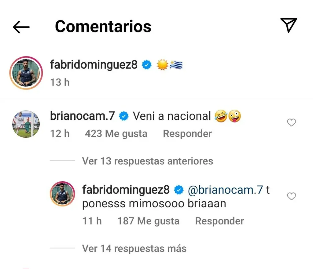 "Vení a Nacional", le escribió Ocampo, a lo que Domínguez respondió: "Te ponés mimoso, Brian", todo en tono de broma.