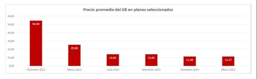 Por otro lado, el precio promedio abonado del GB en los planes seleccionados tuvo variaciones significativas, con un descenso de 80%. En diciembre de 2021 el valor del GB era de $ 54,5, frente a $ 11,27 de marzo de 2023.