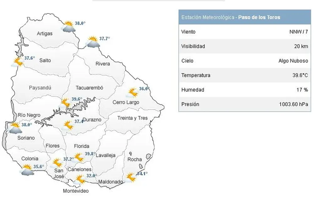 El parte de la Dirección Nacional de Meteorología actualizado a las 17:00 mostró la máxima temperatura del día con 39.8 ºC registrados en la estación de Florida. Más al norte, en Tacuarembó, la máxima fue de 39.6 ºC.