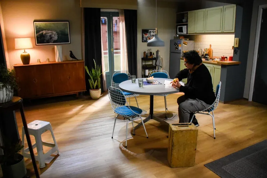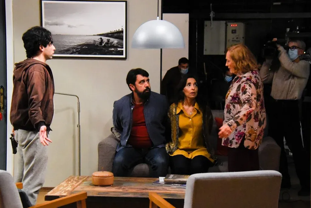 Plano general. Alrededor de ellos, sobre el escenario de la sala Campodónico del teatro El Galpón, se construyó un set televisivo: un apartamento, con su respectiva entrada, living, cocina, dormitorio y baño. Fuera de las paredes simuladas los técnicos ajustan luces y prueban sonido, mientras el director de cámaras, Guillermo Casanova, supervisa el ensayo pocos minutos antes de dar la voz de acción.