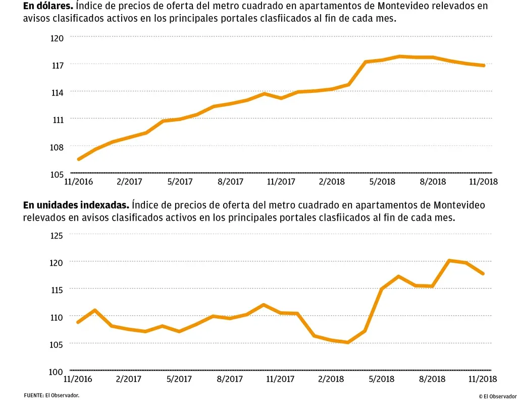 El Índice de Precios de Oferta de Inmuebles en Montevideo de El Observador (IPOI-EO) tuvo una baja de 0,2% en noviembre respecto al mes anterior. De esta manera, profundiza el retroceso de octubre de igual magnitud y la caída de 0,3% que tuvo en setiembre.