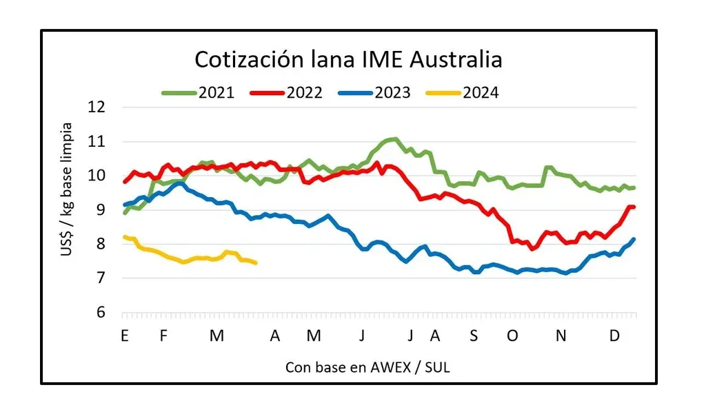 Con una baja semanal del 1% en el Indicador de Mercados del Este (IME) la actividad comercial de la lana en Australia se fue al receso de Pascua en su nivel más bajo desde mediados de febrero, US$ 7,45 por kilo en base limpia.
