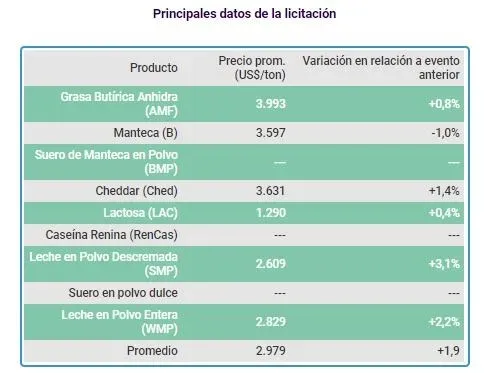 La señalada suba global en relación a la licitación anterior ubica al precio promedio de todos los lácteos negociados en US$ 2.979 por tonelada.