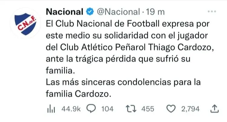 Peñarol y todo el fútbol uruguayo se solidarizaron con él. Hasta Nacional emitió un mensaje público de condolencias.