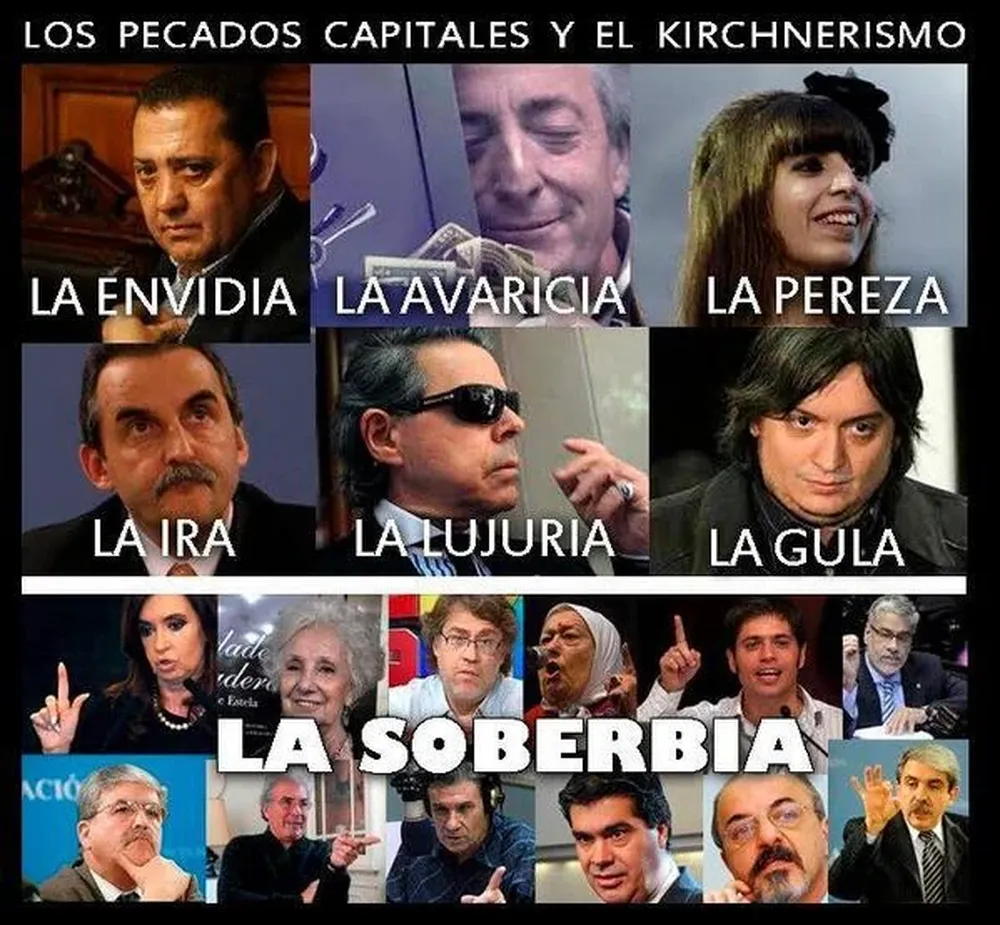 Tinelli recurrió a Twitter para descargar su enojo y, entre algunos tweets propios y respuestas a otros, retuiteó una imagen donde se podía leer “los pecados capitales y el kirchnerismo”. En la imagen se asociaba cada uno de los pecados capitales a una figura K.