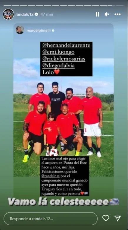 "Felicitaciones querido @randalr.12 (cuenta del jugador) por el campeonato mundial ganado ayer para nuestro querido Uruguay. Sos el 1 en todo, jugando y como persona", agregó el argentino.