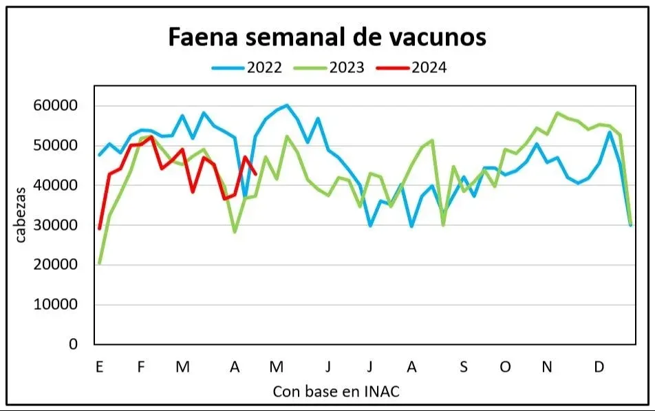 La faena vacuna cayó 9% en la última semana, con 42.749 cabezas, en parte con cargas afectadas por excesos de lluvias. En un año excepcional desde el punto de vista forrajero, vale destacar los crecientes promedios de peso del ganado a faena. Los novillos promedian 534 kilos en pie frente a 522 kilos el año pasado. El peso en cuarta balanza promedia 290 kilos, casi 10 kilos más que hace dos años.
