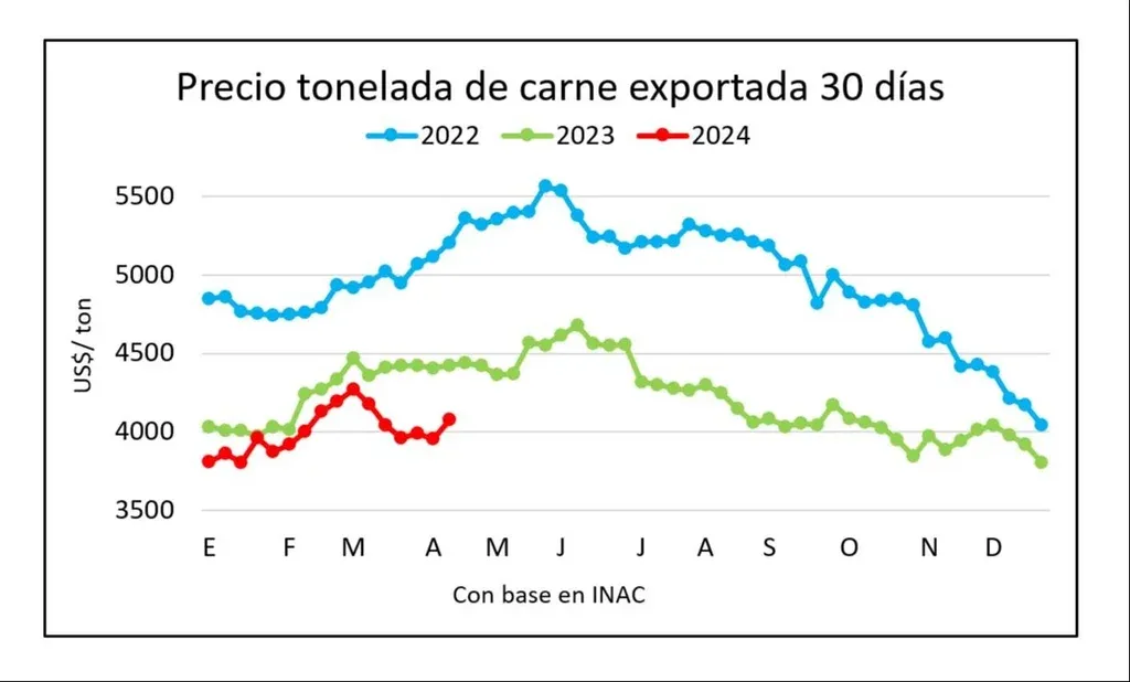 Blasina y Asociados El precio de exportación de la carne vacuna uruguaya oscila sobre el eje de los US$ 4.000 por tonelada. La semana pasada fue de US$ 4.198, de acuerdo al Instituto Nacional de Carnes (INAC). En los últimos 30 días promedió US$ 4.075, muy cercano a los US$ 4.054 registrados en lo que va del año.