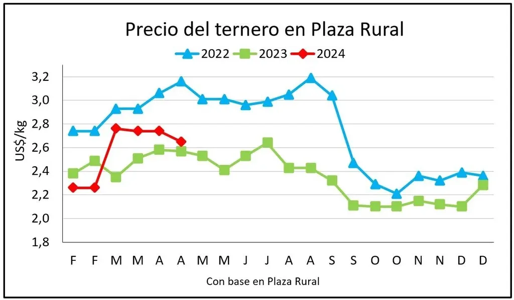 Blasina y Asociados En Pantalla Uruguay los terneros mostraron un promedio de US$ 2,62 por kilo y US$ 473 al bulto, con un destacado 95% de colocación. “El clima está jugando un rol fundamental en que con estos grandes volúmenes estemos con colocaciones arriba del 90%”, destacó Fernando José de La Peña, integrante de Pantalla Uruguay.