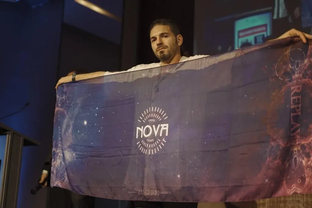 Chen Mizrachi sosteniendo la bandera del festival Nova