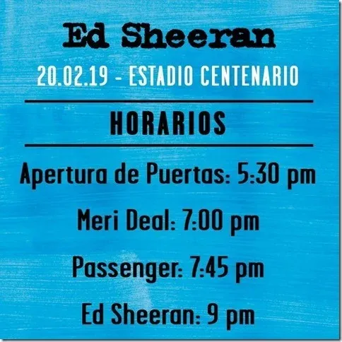 La producción del espectáculo sugiere asistir con tiempo para acceder a los lugares sin demoras, y también para aquellos que quieran ver las presentaciones previas a la de Sheeran. Las puertas del Centenario se abren a las 17.30 horas, y Meri Deal abre la jornada a las 19 horas. Sigue Passenger a las 19.45 y, finalmente, a las 21 horas el baladista pelirrojo sale a escena.