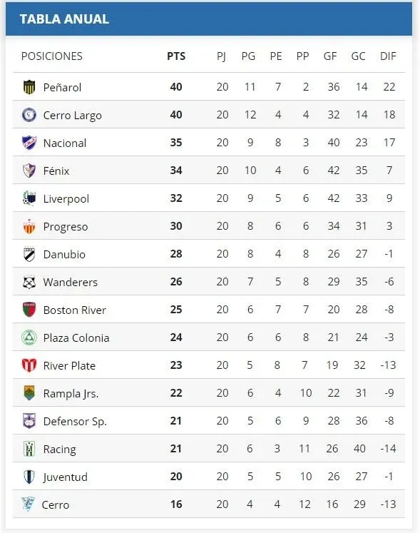 La tabla acumulada tiene hoy a Peñarol y Cerro Largo Largo igualados con 40 unidades, mientras que luego vienen Nacional con 35, Fénix con 34 y Liverpool con 32.