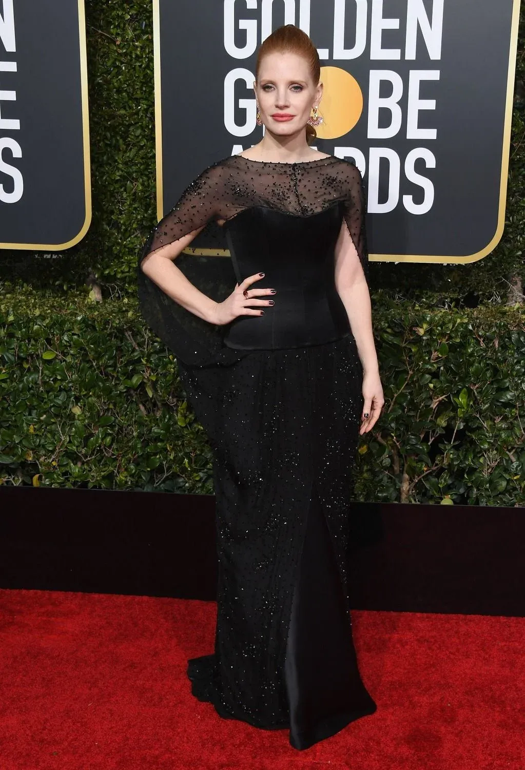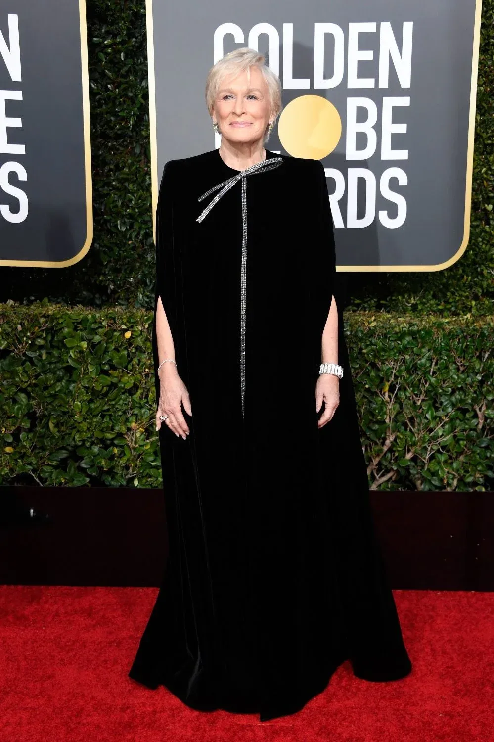 8. Glenn Close con un diseño negro y con mangas (algo cada vez más frecuente en las alfombras rojas) de Armani Pirvé,