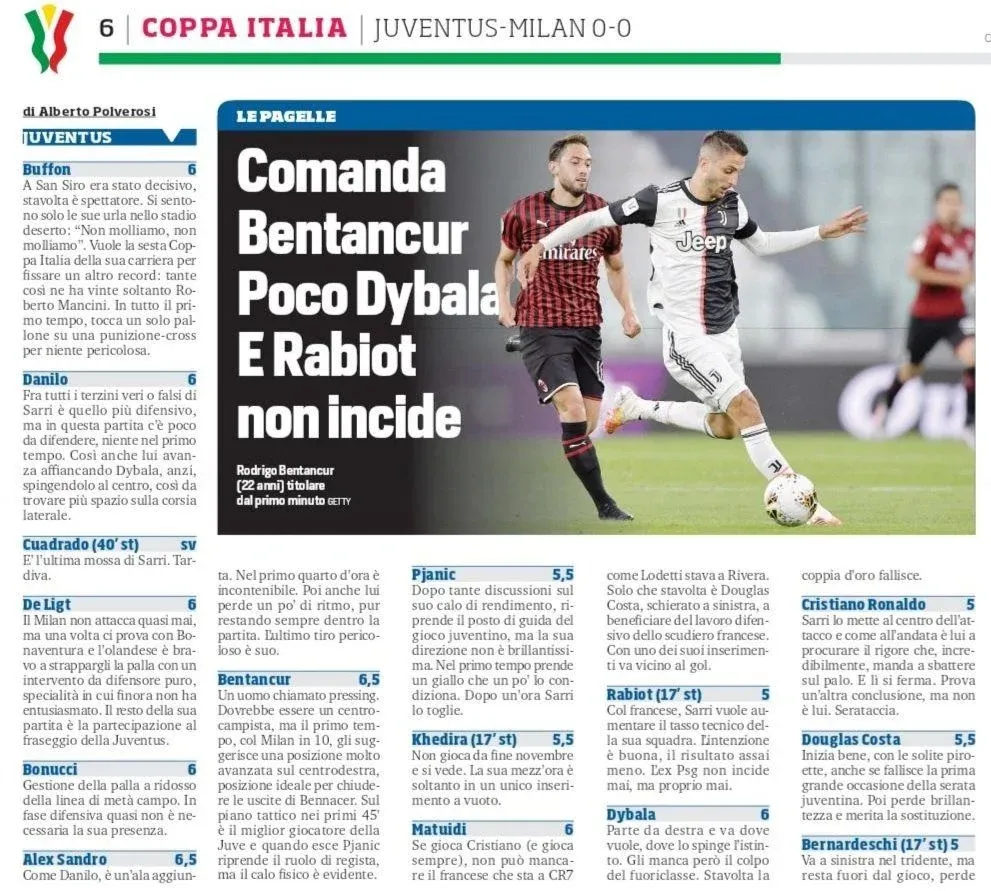 El viernes por la tarde uruguaya volvió el fútbol italiano con un clásico muy esperado entre Juventus y Milan por la semifinal de vuelta de la Coppa Italia y todos los ojos estaban puestos en el regreso de Cristiano Ronaldo, pero quien se terminó llevando los halagos de la prensa (ya que no pudo haber público), fue el uruguayo Rodrigo Bentancur.
