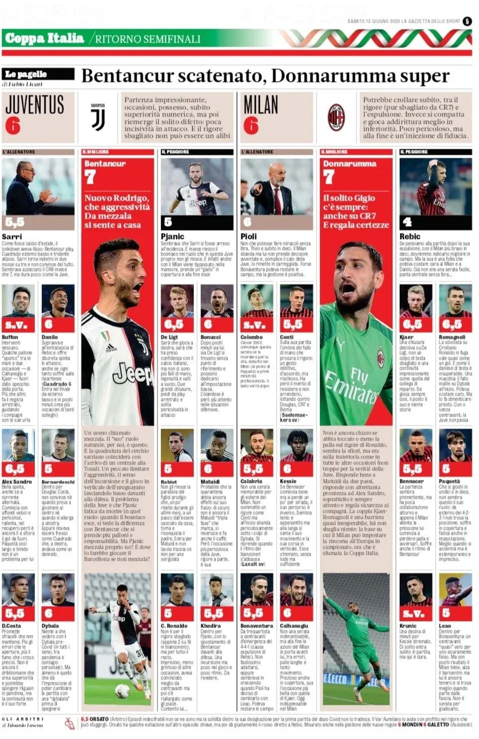 Otro periódico deportivo destacado de la península, Il Corriere dello Sport, lo destacó como la figura de la cancha con 7 puntos, aunque también le dio 7 al arquero de Milan, Donnaruma.