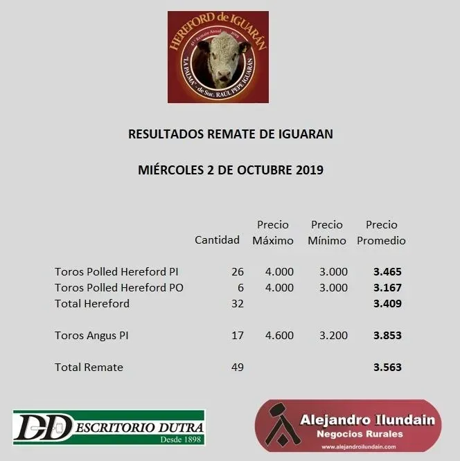 Ventas totales y muy ágiles hubo en la Sociedad Criolla Tabaré Regules –en Trinidad–, cuando los martillos de Escritorio Dutra y Alejandro Ilundain Negocios Rurales remataron la torada Hereford y Polled Hereford del 41er. remate anual Hereford de Iguarán, de cabaña La Palma de Suc. Raúl Pepe Iguarán que alcanzó un precio promedio de US$ 3.409.