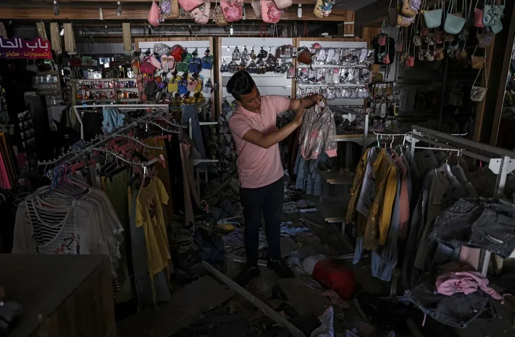 “Esto es polvo de las bombas israelíes, que se ha incrustado en la ropa. No podremos vender esta mercancía”, dijo Bilal Mansur, un vendedor de 29 años.