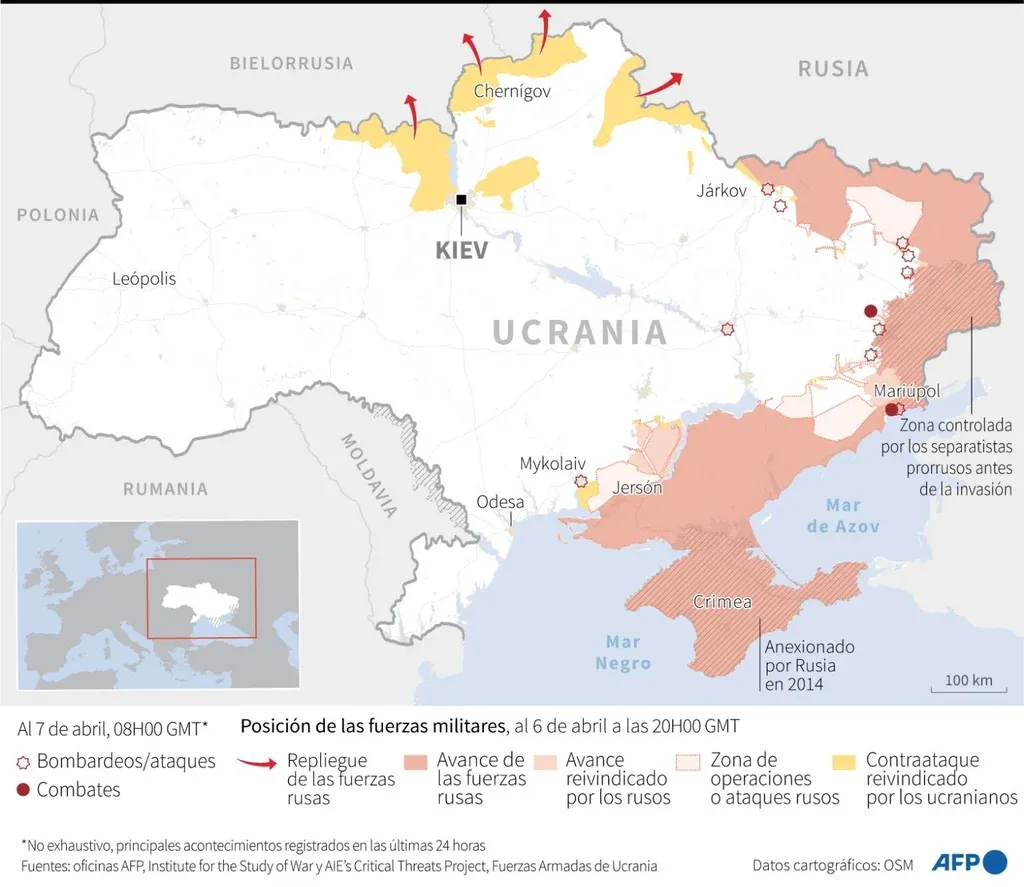 Las fuerzas rusas se retiraron de los territorios del norte, como acordaron en las negociaciones entre autoridades rusas y ucranianas realizadas el 29 de marzo en Turquía pero continúan con su ataque desde el sur y el este de Ucrania.