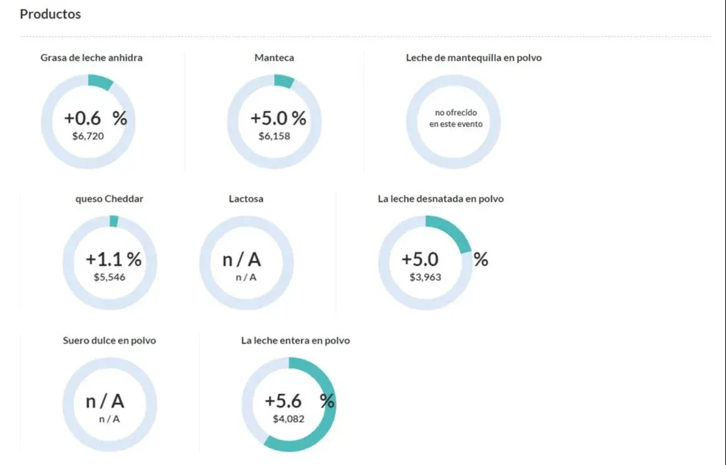 En la lectura por subrubros, en el caso de la leche en polvo entera (WMP), que es el producto lácteo de mayor volumen en las colocaciones externas de Uruguay, el precio promedio tuvo esta vez una suba de 5,6%, al pasar el valor de referencia a US$ 4.082 por tonelada.