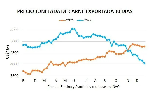 Sin mayores movimientos en el mercado mundial de carne, el precio de exportación en Uruguay cierra el año consolidando el ajuste que comenzó a mitad de año. La última semana la tonelada exportada promedió US$ 4.102, de acuerdo a los datos preliminares del Instituto Nacional de Carnes (INAC), y en los últimos 30 días móviles quedó en US$ 4.047.