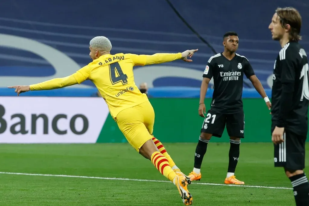 Ronald Araujo festeja su golazo de cabeza para Barcelona en el clásico ante Real Madrid