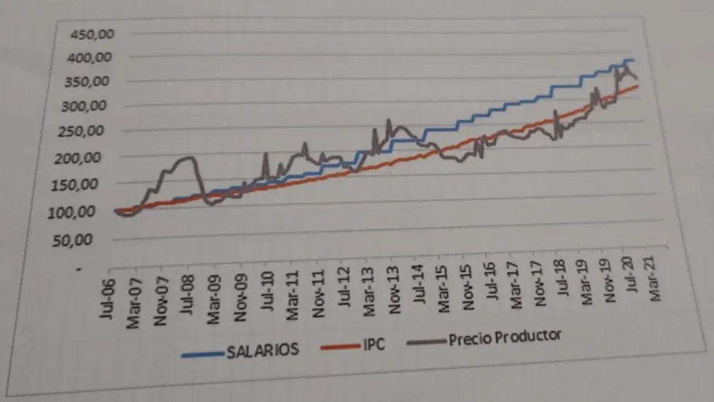 El presidente de Conaprole aseguró que, si se analiza la evolución del salario, del IPC y del precio de la leche “está claro que quienes más se beneficiaron han sido los funcionarios de Conaprole". Eso, "se ve con datos objetivos", dijo y compartió una gráfica hecha para la empresa que sostiene su idea