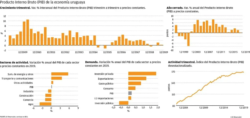 La economía uruguaya se estancó en 2019. Si bien anotó un año más al período de crecimiento más largo de su historia –iniciado en 2003–, fue el año de menor expansión desde la última caída de la actividad, hace 18 años. El dato del cuarto del año pasado fue más flaco de lo esperado por los analistas, y alguno ya proyecta una recesión cercana a medio punto del PIB si el coronavirus tiene un efecto acotado a tres meses.