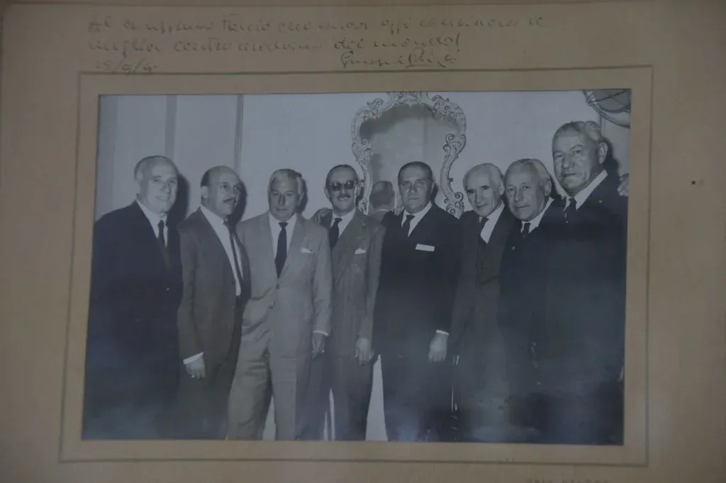 Una foto histórica: Héctor Scarone, Roberto Porta, Mumo Orsi, De Vicenzi, Giuseppe Meazza, Guillermo Stábile -goleador del Mundial de Uruguay 1930-, Atilio De María, bicampeón del mundo con Italia en 1934 y 1938, y Ricardo Faccio, cuando Inter vino a jugar la final de la Copa Intercontinental con Independiente en Avellaneda en 1964