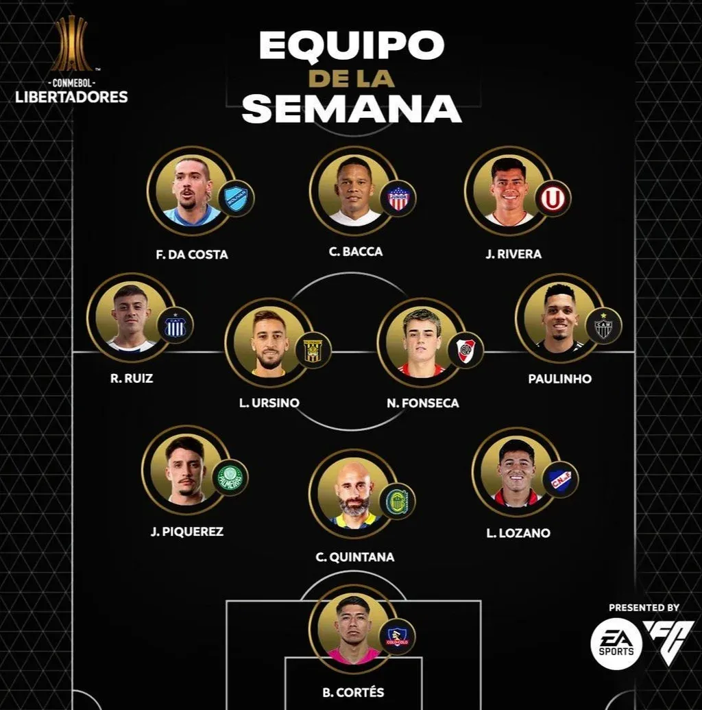 Los otros dos uruguayos que aparecen entre los 11, son Nicolás Fonseca, quien convirtió un golazo de 35 metros para River Plate de Argentina en la victoria 2-0 ante Deportivo Táchira por el grupo de los tricolores, y Joaquín Piquerez, quien también anotó otro golazo, de tiro libre, para darle el empate de visita a Palmeiras ante San Lorenzo en el grupo de Liverpool.