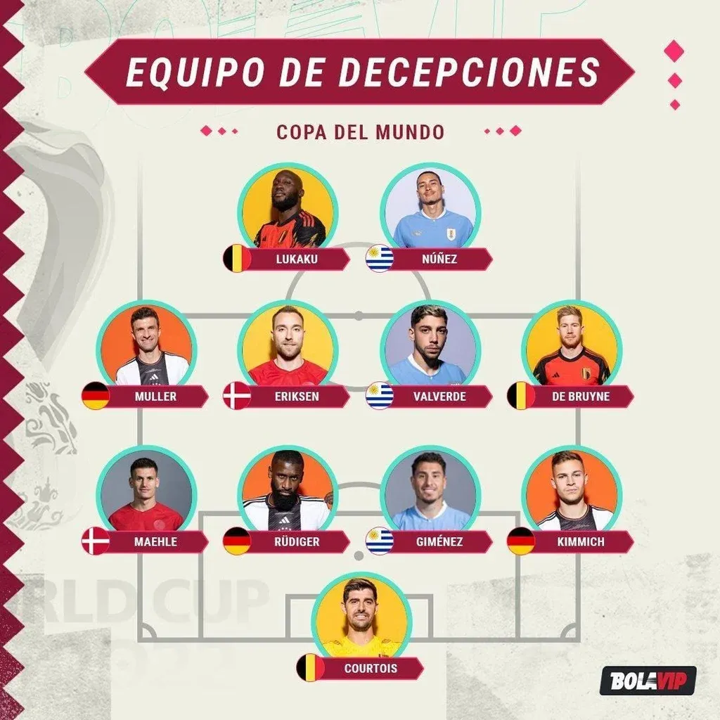 Tres futbolistas de la selección uruguaya forman parte del equipo de las decepciones del Mundial Qatar 2022, según un el portal deportivo Bolavip, que armó una oncena con futbolistas que llegaban en un gran momento y que quedaron eliminados en primera ronda con sus selecciones.