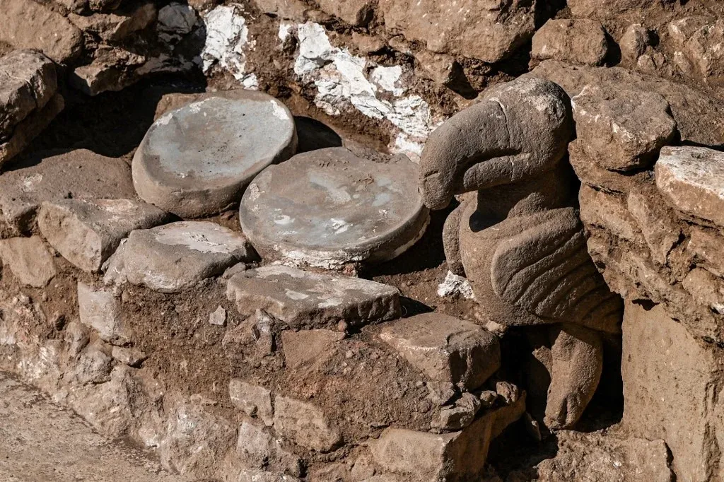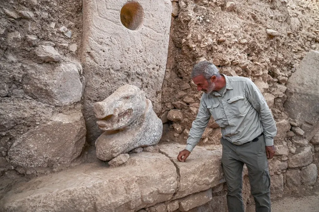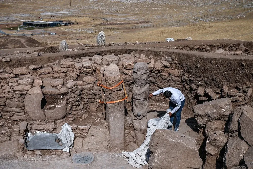 Esta estatua de piedra de más de 2,30 metros de altura, sentada en un banco decorado con un leopardo, fue descubierta en septiembre en el sureste de Turquía, en el corazón de un complejo de una veintena de yacimientos que albergó a miles de humanos en la Edad de Piedra, hace 12.000 años.