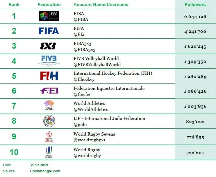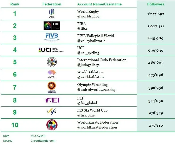 La institución más seguida es la International Rugby Football Board (o World Rugby) con 1.277.697 de usuarios en su lista de seguidores. Debajo, y con una diferencia de 250.286 seguidores, le sigue la Federación Internacional de Baloncesto (FIBA). En el tercer lugar se ubica la cuenta oficial de la Federación Internacional de Voléibol (FIVB), que no llega al millón de followers (845.989). Luego sigue la UCI tiene 696.630 seguidores, la federación de yudo con 486.605, y la de atletismo con 475.096. Por debajo de ellos, se encuentran la Federación de Lucha Olímpica (392.956), la Federación Ecuestre Internacional (374.050). Cierran el top ten la organización de la Copa del Mundo de Esquí Alpino y la Federación Mundial de Karate, con 276.379 y 275.810 seguidores respectivamente.